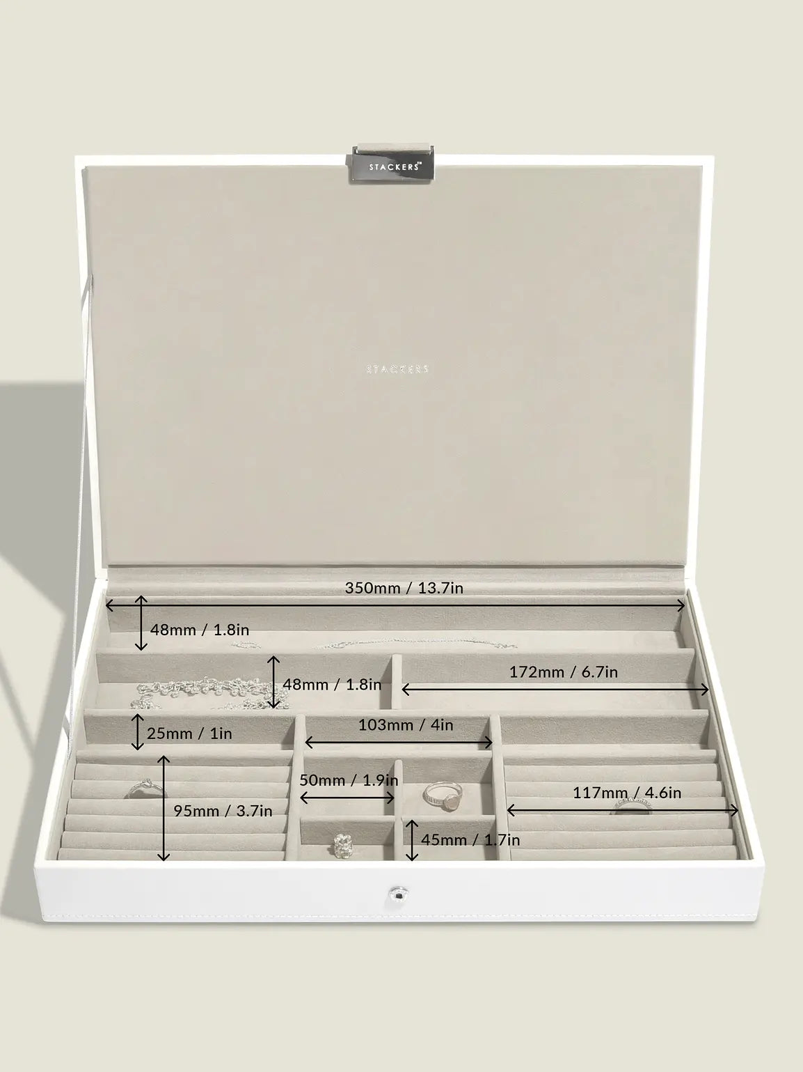 Het Supersize juwelendoosdeksel is het perfecte uitgangspunt voor uw XL Stackers juwelendoos of om te gebruiken als een op zichzelf staand stuk op uw dressoir. Onze unieke stapelbare juwelendozen zijn slim ontworpen zodat u uw eigen doos kunt samenstellen door te kiezen welke lagen en accessoires het beste bij uw juwelencollectie passen.